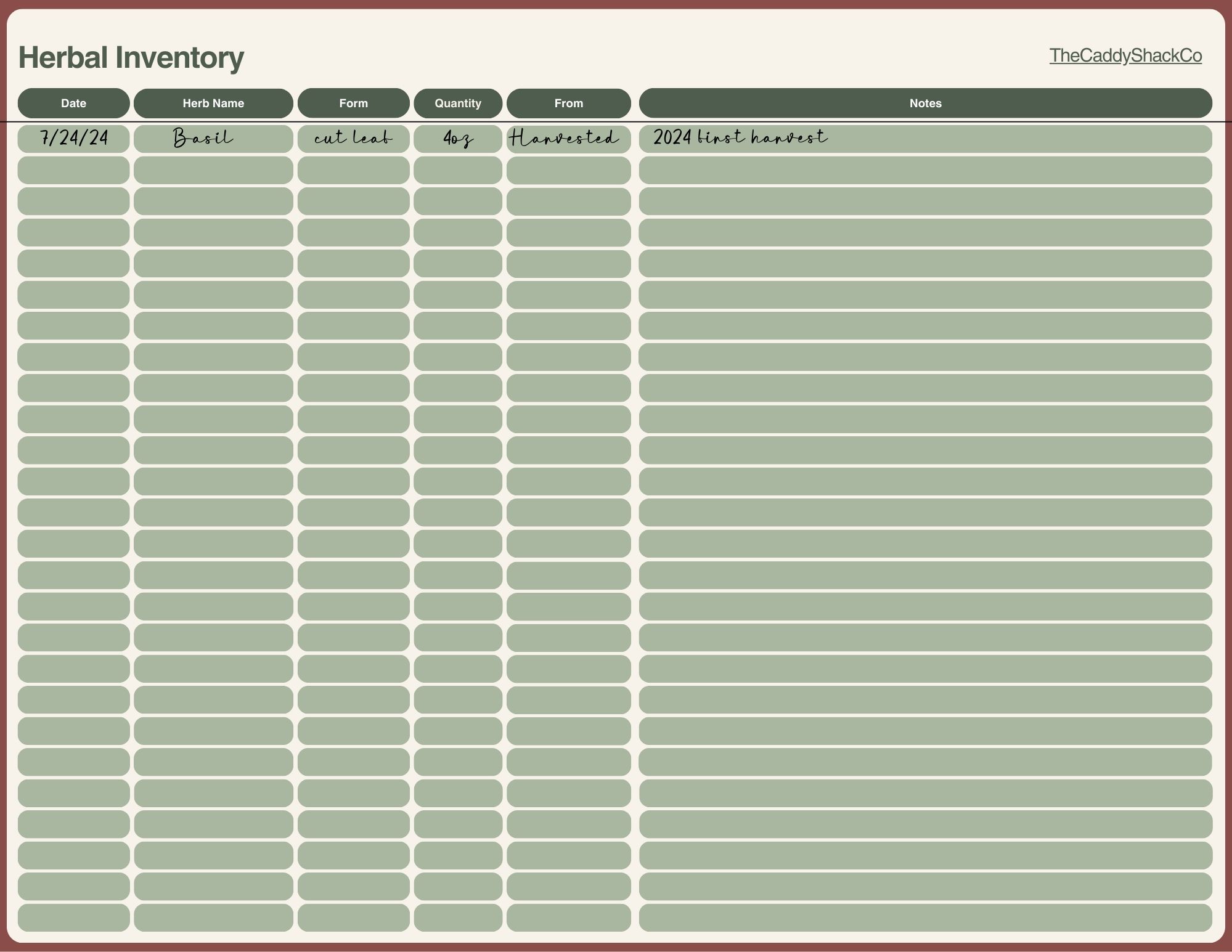 This Herbal Inventory Digital Download is designed to help you track your herb collection in a clear, practical way—whether you’re harvesting from your own garden, stocking an apothecary shelf, or managing everyday kitchen herbs.