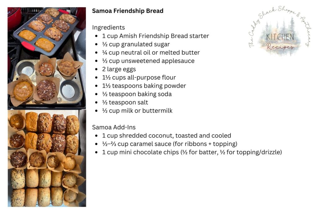 Not too long ago I shared how to make and maintain Amish Friendship Bread starter, but I never actually posted a recipe for what to do with it once you have a bubbling jar on the counter. The “classic” loaf is simple and really good—starter, cinnamon, vanilla, and a standard batter that bakes up moist and sweet. You can toss in chocolate chips and walnuts and it becomes one of those easy crowd-pleasers you can eat warm with coffee. But I’ve got a weak spot for Girl Scout cookies—specifically Samoa—so naturally my brain went straight to toasted coconut, caramel, and chocolate.